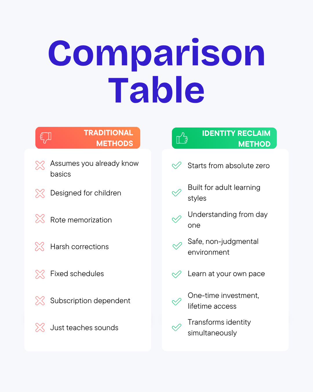 "I'm 26 and spent years trying to learn with apps, books, even expensive tutors. Nothing worked until this. I went from knowing zero letters to reading full verses in just 4 months. The tools they teach you stay with you forever."