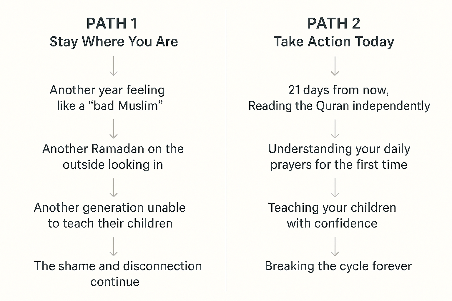 Your children are growing up with Quranic literacy as normal. They'll never feel the pain you felt. Your relationship with Allah has deepened in ways you couldn't imagine.